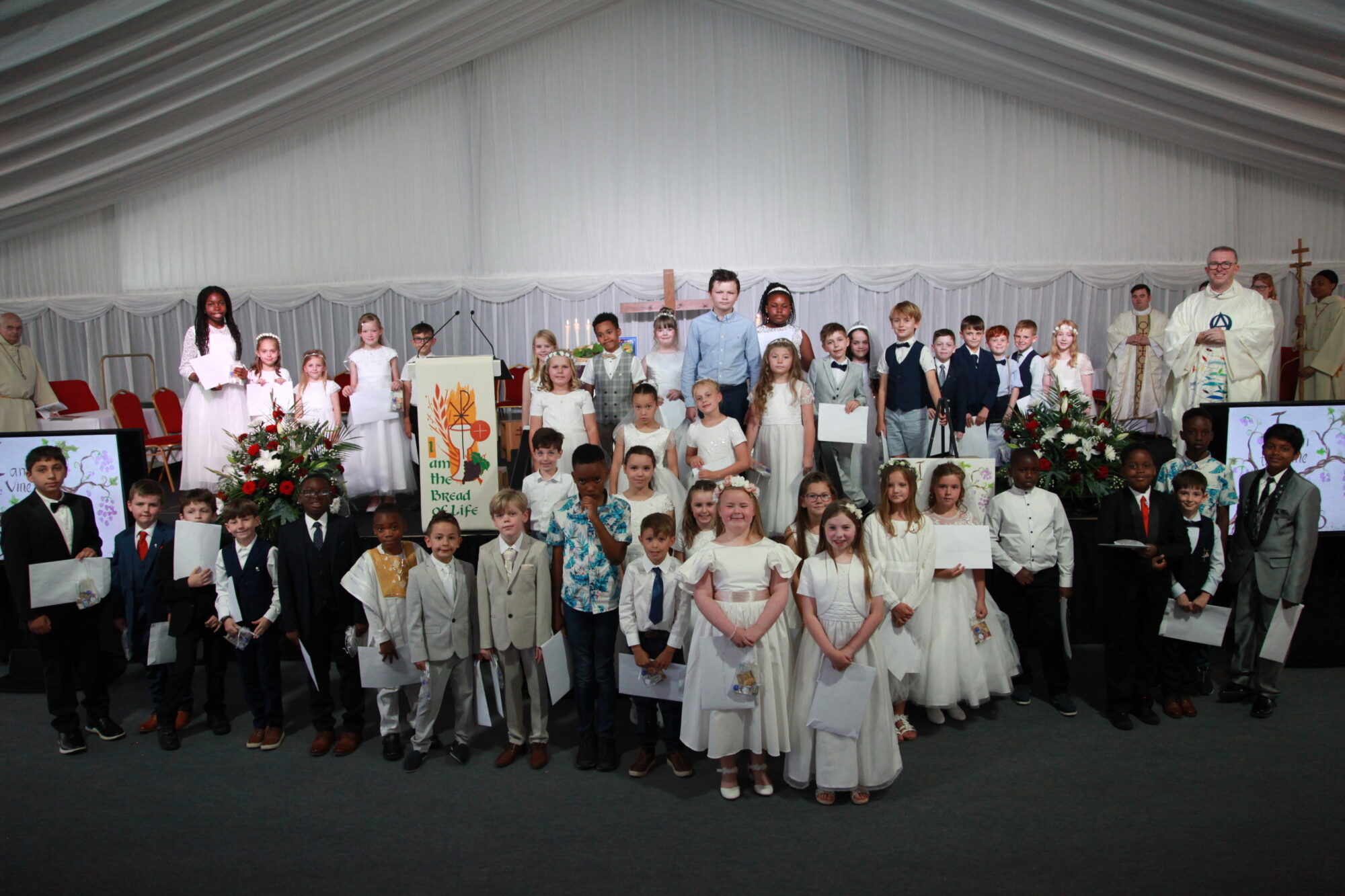 Your child will receive their first Holy Communion between the weekends of Sunday 11th May 2025 to Sunday 15th June 2025, during their regular Sunday Mass in the church where they normally attend. When completing your application form, please advise us on any weekend where you have a prior commitment, as this will assist us when assigning a Mass to your child and family. The date of the celebratory ‘going forth’ Mass bringing all of this year’s first Holy Communion cohort together again in on Sunday 29th June 2025 at 2:30pm in New Hall School